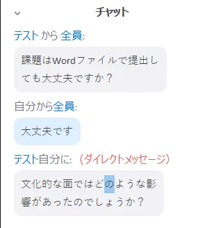 上の画像の2つ目の質問のように,赤字で「ダイレクトメッセージ」とあるものは,他の受講者には見えていないので,教員が質問を口頭で読み上げるか,コピーして全体チャットに流すことをお勧めします.