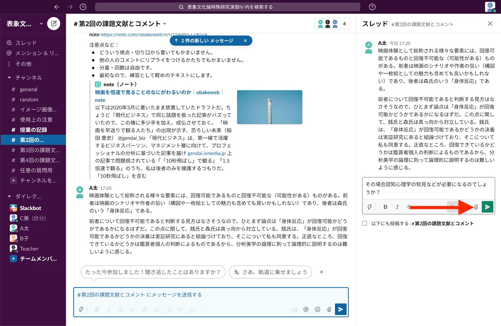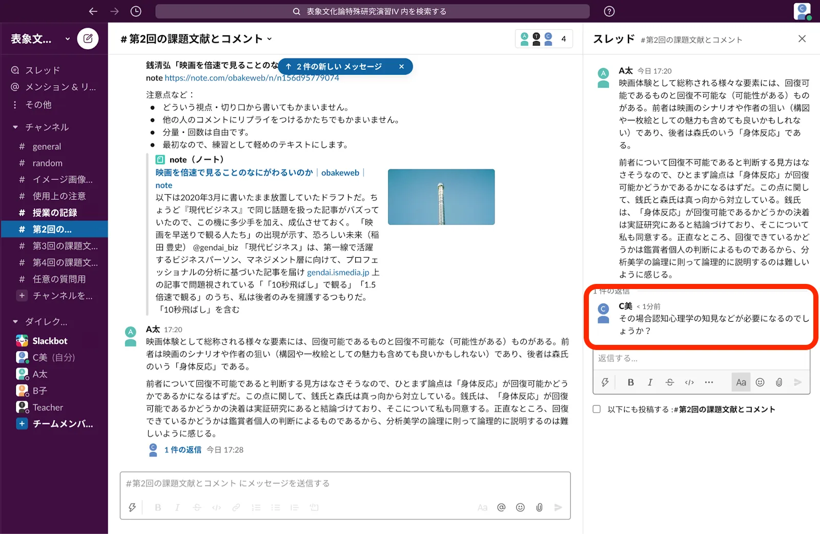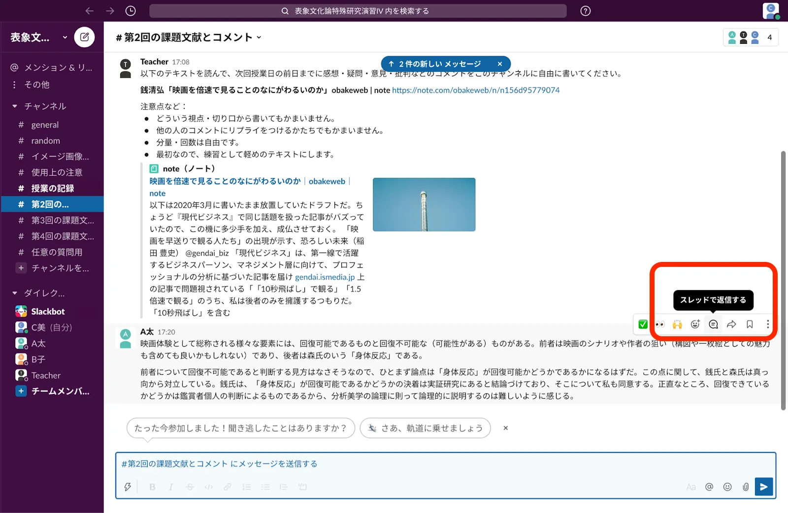 - 課題文献ごとにひとつのチャンネルを用意します.授業の1週間前に課題文献をスレッドの形で提示します.