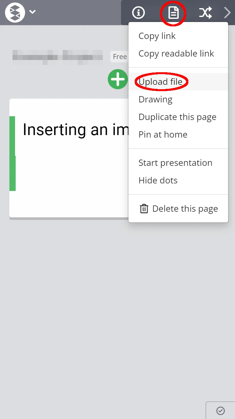 On the right side of the screen, You can also select “Upload file” from the icon (red circle in the image below) and select the file you want to insert.