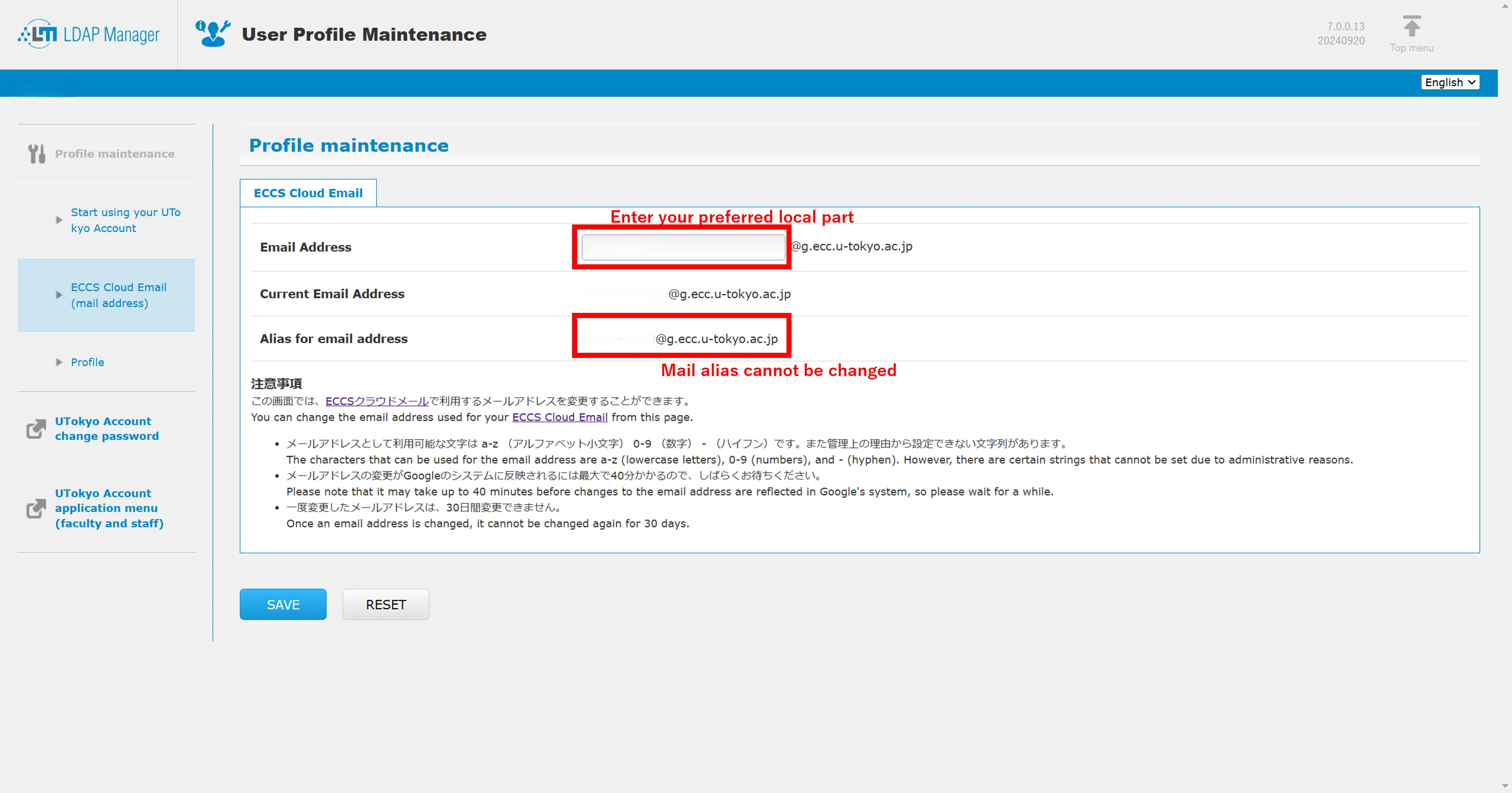 - Click “ECCS Cloud Email (mail address)” on the left to open the email address setting page. Enter your preferred username in the “Email Address” field and click “SAVE”.