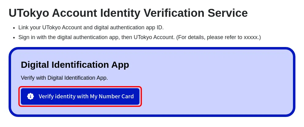 The UTokyo Account Identity Verification Service is a system that allows you to verify your identity online using your My Number Card (Individual Number Card of Japan) that has been pre-linked with your UTokyo Account, in case you are unable to sign in to your UTokyo Account.