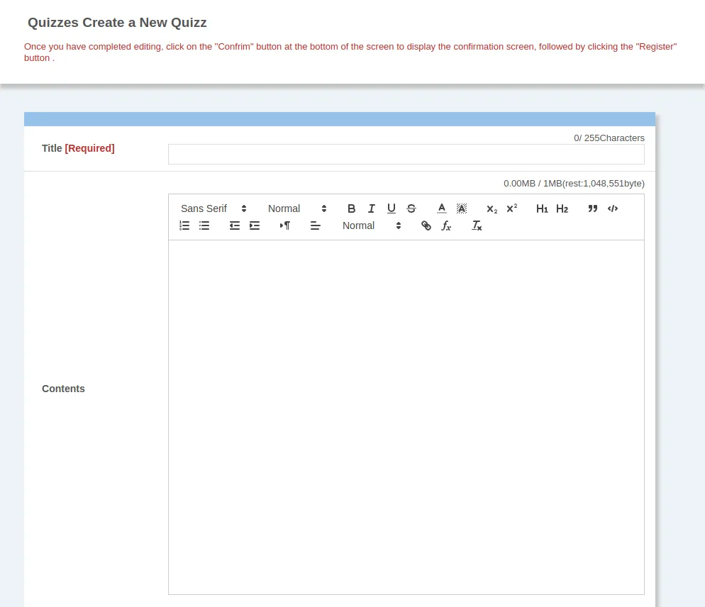 After you have finished setting up the entire test and creating the questions, click on “Confirm” at the bottom of the “Create a New Quiz” screen to check the contents, and then click on “Register” to register for the test.