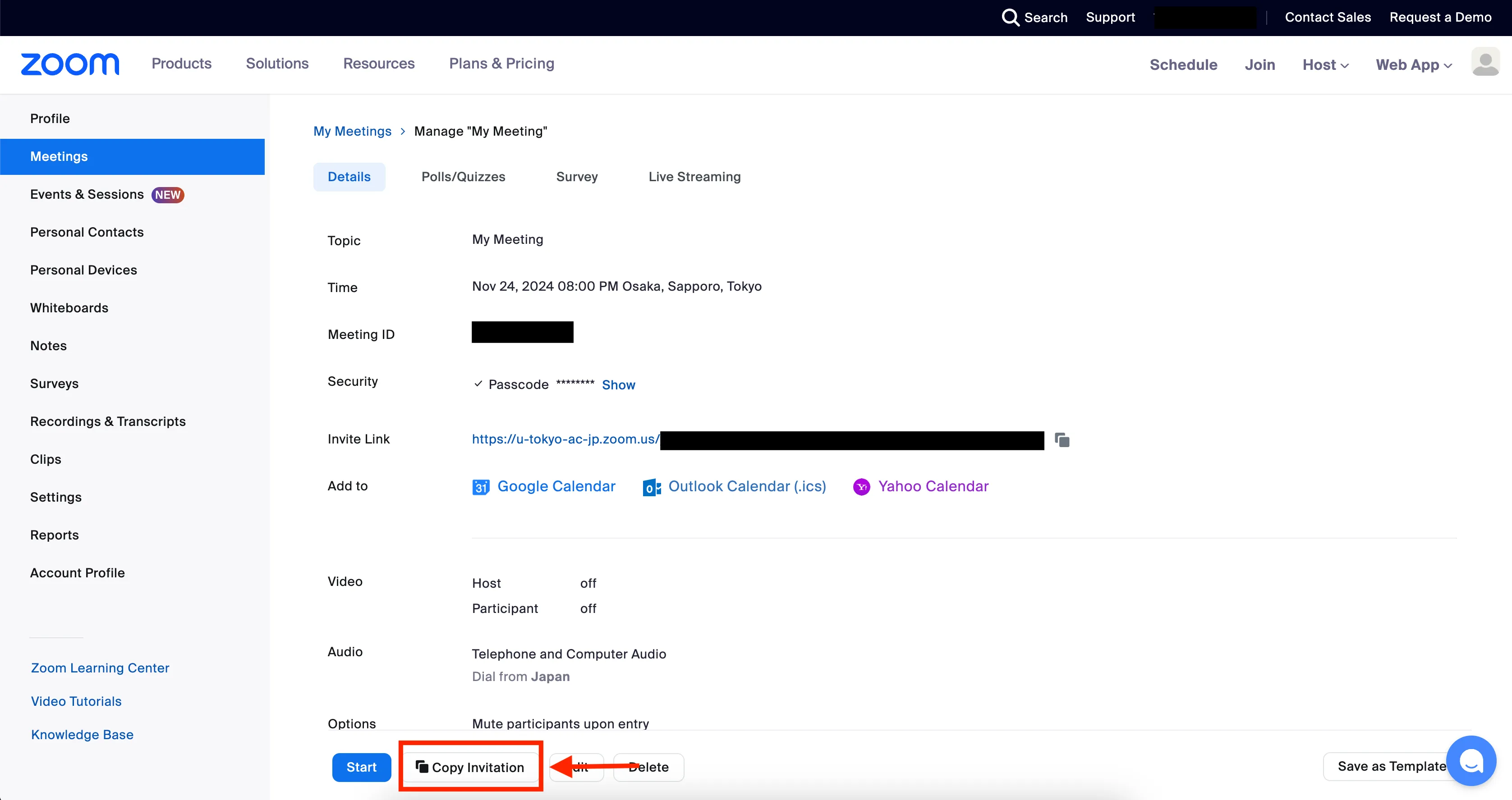 • Copy the “Invitation Link” displayed on the meeting details screen and share it with the participants. Additionally, it is helpful to share the “Meeting ID” and “Passcode” along with the “Invitation Link”.