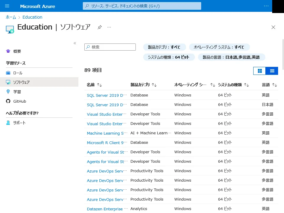 5. 「Microsoft Azure」の画面が表示されたら,「Education」画面の左側にあるメニューから「ソフトウェア」を開いてください.