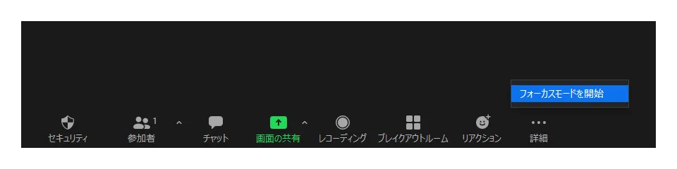 フォーカスモードを利用したい場合は,まず,Zoomの「設定」画面にて,「フォーカスモード」をオンにしてください.この設定をオンにすると,自分がホストとして作成(スケジュール)したミーティングにおいて,下部のコントロールの「詳細」の中に「フォーカスモードを開始」という項目が表示されるようになります.ミーティング中,実際にフォーカスモードを使う際は,この「フォーカスモードを開始」を押してください.