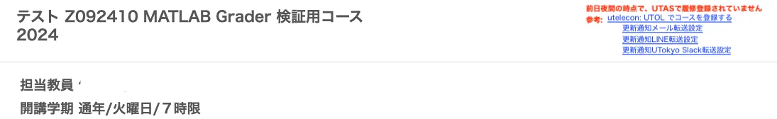 UTOL(UTokyo LMS)における「履修」という用語が,教務的な(学部通則等で用いる)「履修」とは異なる用法で使用されていることによる混乱を解消するため,2025年3月25日(火)に時間割表やコーストップ画面の一部を修正しました.これにより,UTASと連携されている科目(コース)に「学生」ユーザが「履修者」として参加しているが,UTASでの履修登録をしていない場合,時間割表やコーストップ画面にUTASでの履修登録を促す文言などが表示されるようになりました.