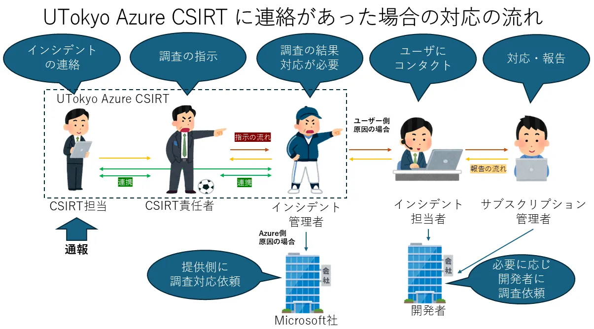 その際のお願いとして,UTokyo Azure CSIRT では UTokyo Azure 上で発生したインシデントを把握,記録しておりますので,UTokyo Azure CSIRT の対応は不要と判断した場合でも,UTokyo Azure CISRT にも何らかのご一報をお願いいたします.