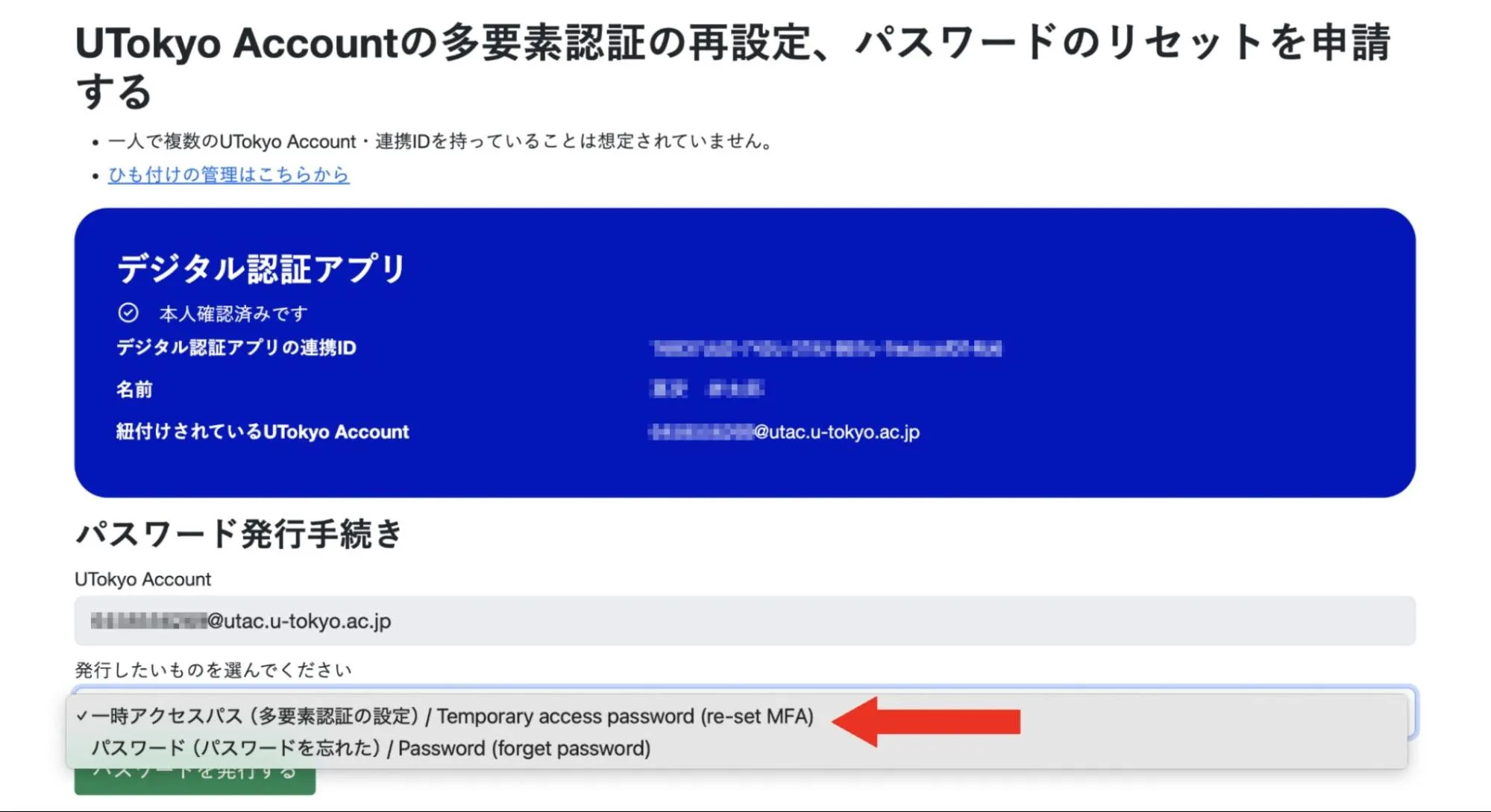 「UTokyo Accountの多要素認証の再設定、パスワードのリセットを申請する」を押してください.