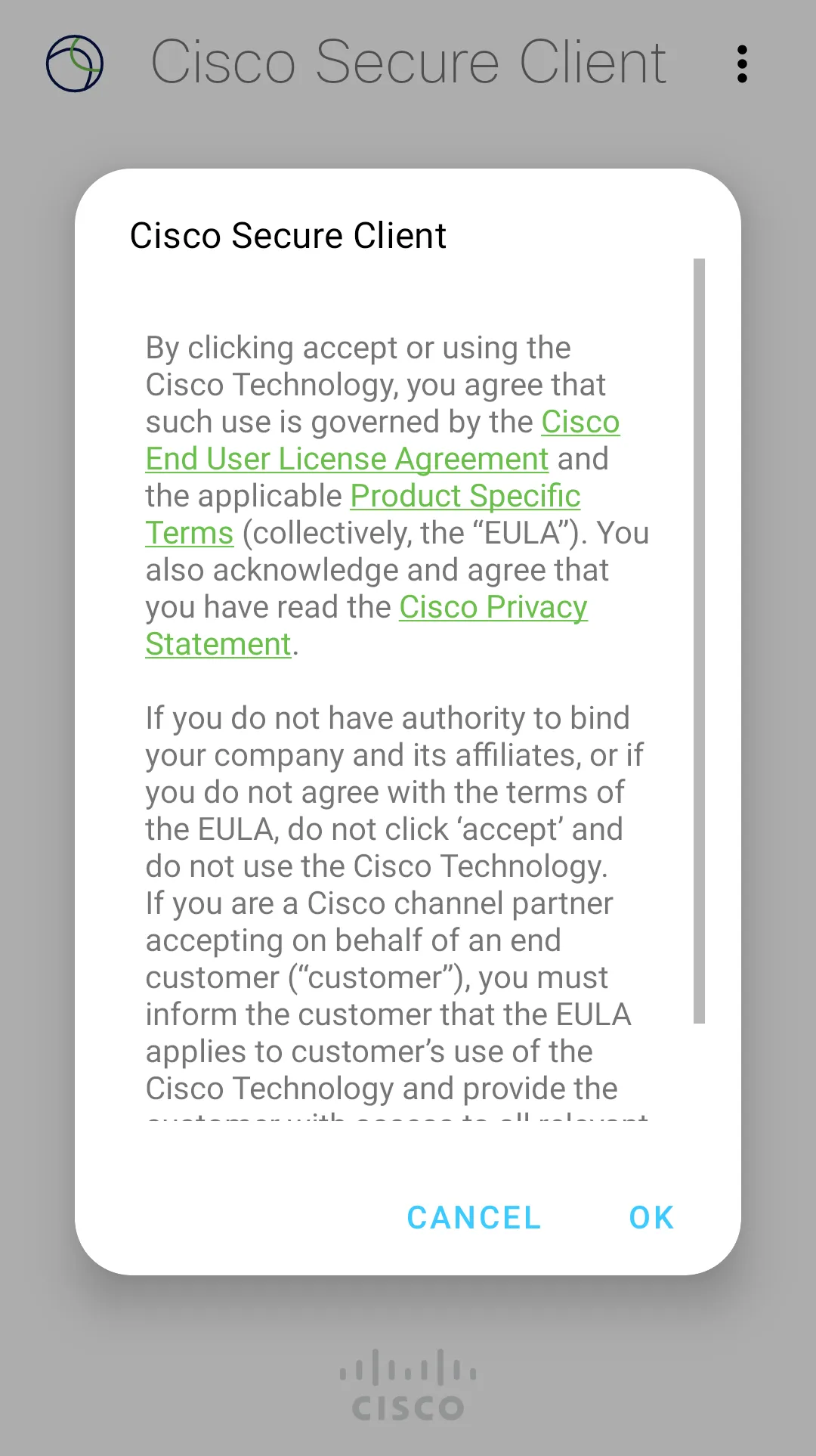 手順B: インストールを終えてSecure Clientアプリを開くと,以下の1枚目のような画面が出るので内容を確認のうえ「OK」をタップしてください.2枚目のような画面が出たらインストールは完了です.
