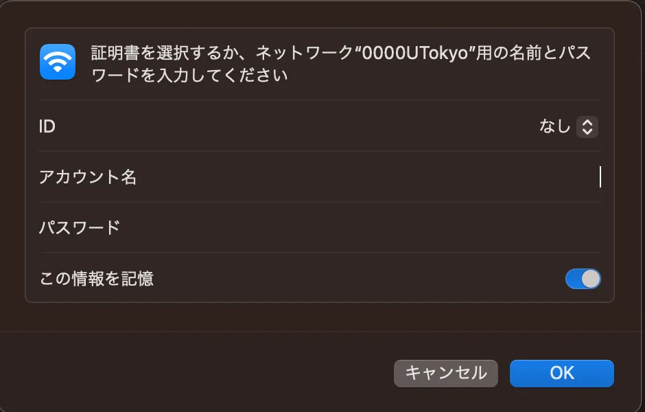 | パスワード | UTokyo Wi-Fiのパスワードを入力してください |
