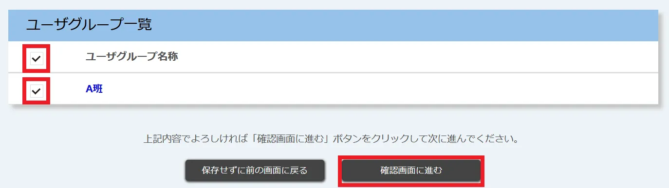 4. 「ユーザグループ一覧」から公開対象とするユーザグループのチェックボックスをすべて選択してください.完了したら,「確認画面に進む」を押してください.(「ユーザグループ一覧」の真下にあるチェックボックスを選択すると,表示されているすべてのユーザグループを一度に選択できます.)