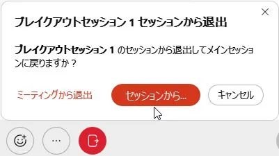 - 退出: 会議室から退出します.ブレイクアウトセッションに参加している時は,ブレイクアウトセッションから抜けてメインミーティングに戻るときもここを押します.