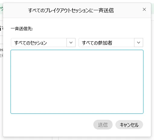 - 「一斉送信」を押すと,特定のセッションやすべてのセッションの参加者にメッセージを送ることができます.
