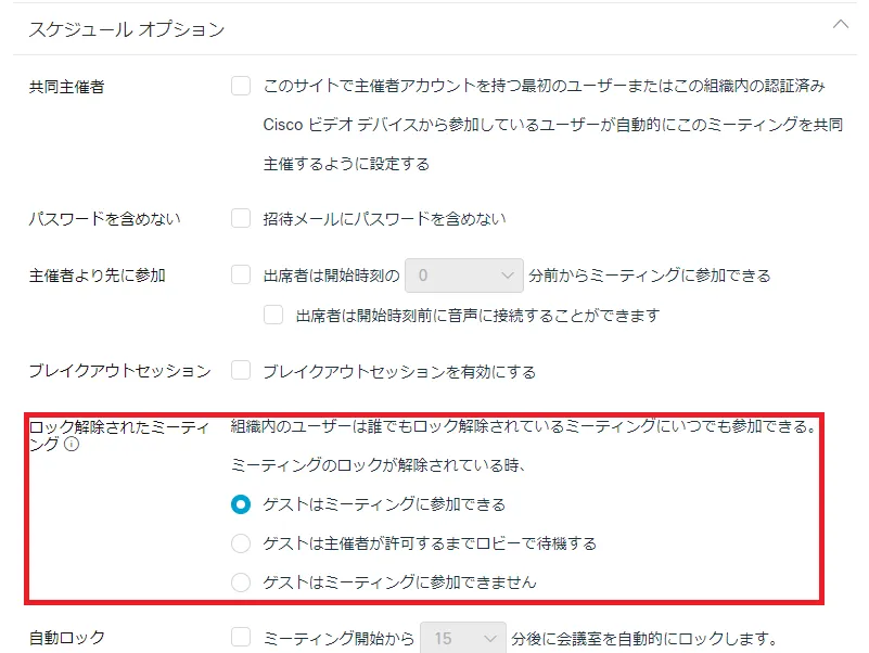 スケジュール時に設定すると,ミーティングをロックしていない状態でも未登録の(utelecon.webex.comにアカウントを持っていない)参加者が来た時にロビーに送ることもできます.ロックしていない状態でutelecon.webex.comにアカウントを持っている参加者が来た場合は阻む方法はありません.