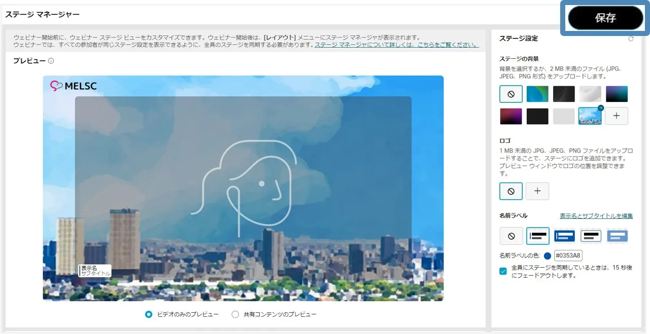 ステージマネージャー機能を使用すると,背景やロゴ・カスタマイズした名前ラベルをステージに設定でき,効果的なウェビナーの開催に貢献します.