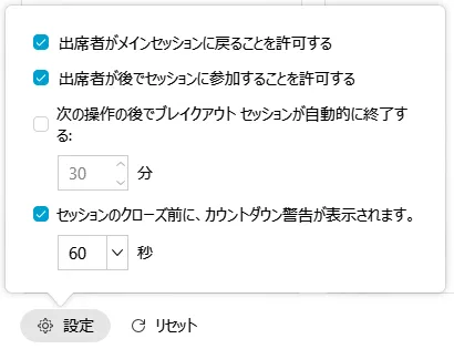 - 「設定」をクリックすると,参加者のブレイクアウトへの途中参加や途中退出(メインミーティングへの移動)を許可するか,セッションの制限時間,時間切れまでのカウントダウンタイマーの設定をすることができます.