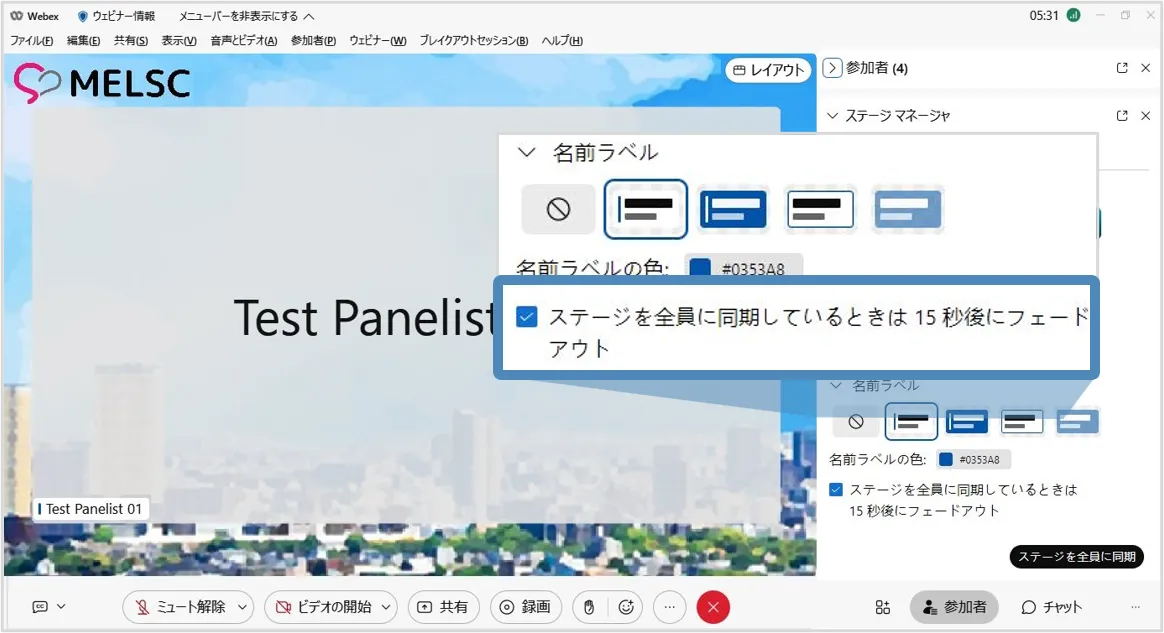 ※停止した場合,出席者はステージマネージャーで設定した背景などは利用することはできません.再度「同期」するとステージマネージャーで設定したレイアウトを使用できます.