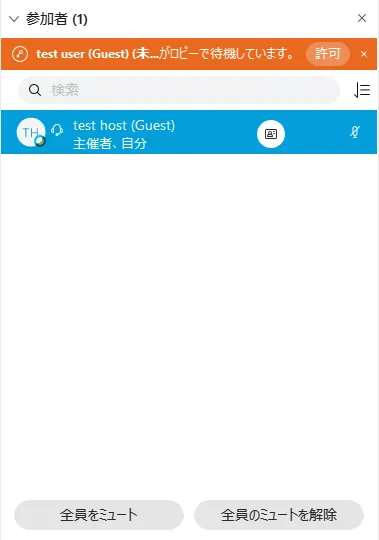 ロビーで参加者が待っていると,参加者一覧の上に表示されるので,確認して参加を許可することができます.